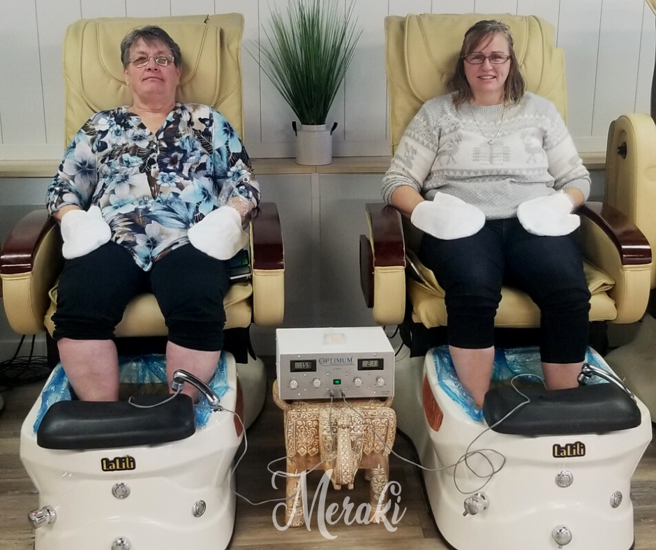 Sit back in one of our comfortable chairs and relax your tired feet in a warm ionized water treatment.
